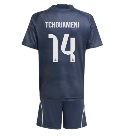 Otroške Nogometnih dresov Real Madrid Aurelien Tchouameni #14 Gostujoči 2025-26 Kratki rokavi (+ hlače)